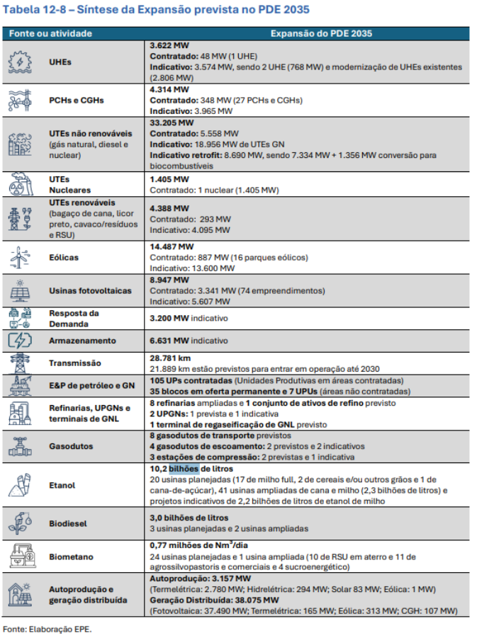 O PDE 2035 sinaliza um ciclo relevante de investimentos e uma transição estrutural da matriz elétrica brasileira. Observa-se: