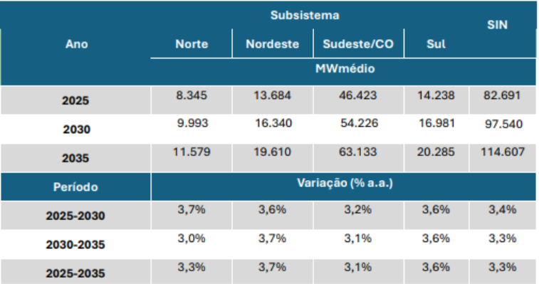 No cenário de referência, a carga no Sistema Interligado Nacional (SIN) deve crescer, em média, 3,3% ao ano até 2035, passando de 82.691 MW médios para 114.607 MW médios.