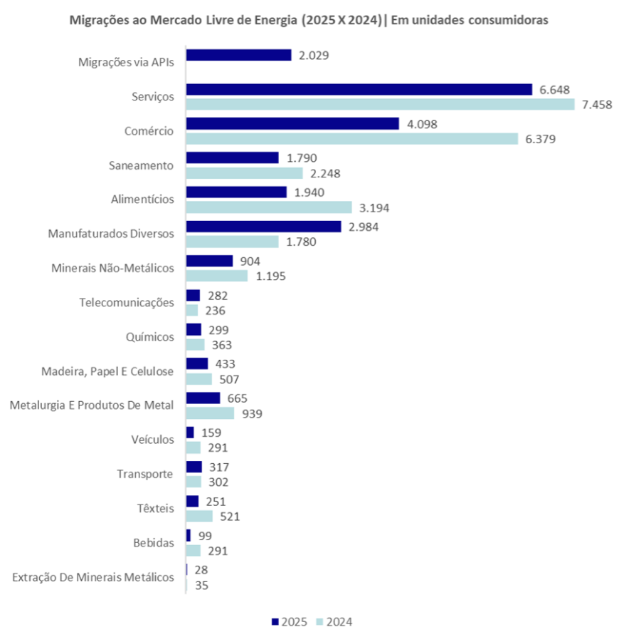 Em 2025, o setor de serviços respondeu por 6.648 novas unidades consumidoras no Ambiente de Contratação Livre (ACL), enquanto o comércio somou 4.098 migrações. Na sequência aparecem os segmentos de manufaturados diversos (1.940), saneamento (904) e alimentícios (665).